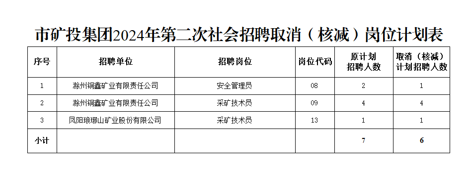 根據(jù)《滁州市興滁礦業(yè)投資集團有限公司2024年第二次社會招聘公告》規(guī)定,經(jīng)對各崗位報名情況篩查審定,結合資格復審情況,部分崗位報名情況未達到開考比例,經(jīng)研究決定取消(核減)以下崗位招聘計劃: