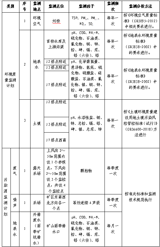 (6)招標(biāo)范圍及內(nèi)容:對興天礦業(yè)諭興礦進(jìn)行環(huán)境監(jiān)測和檢測,包括但不限于土壤、地下水、廢水、廢氣、噪聲等污染源進(jìn)行監(jiān)測和檢測,每月出具監(jiān)測和檢測報(bào)告。監(jiān)測和檢測報(bào)告需滿足各級主管單位、國家法律法規(guī)、行業(yè)檢測標(biāo)準(zhǔn)、《滁州市興天礦業(yè)有限公司安徽省天長市諭興地區(qū)建筑用玄武巖礦年產(chǎn) 800 萬噸露天采礦項(xiàng)目環(huán)境影響報(bào)告表》中所涉及范圍等要求,保證審批順利通過。